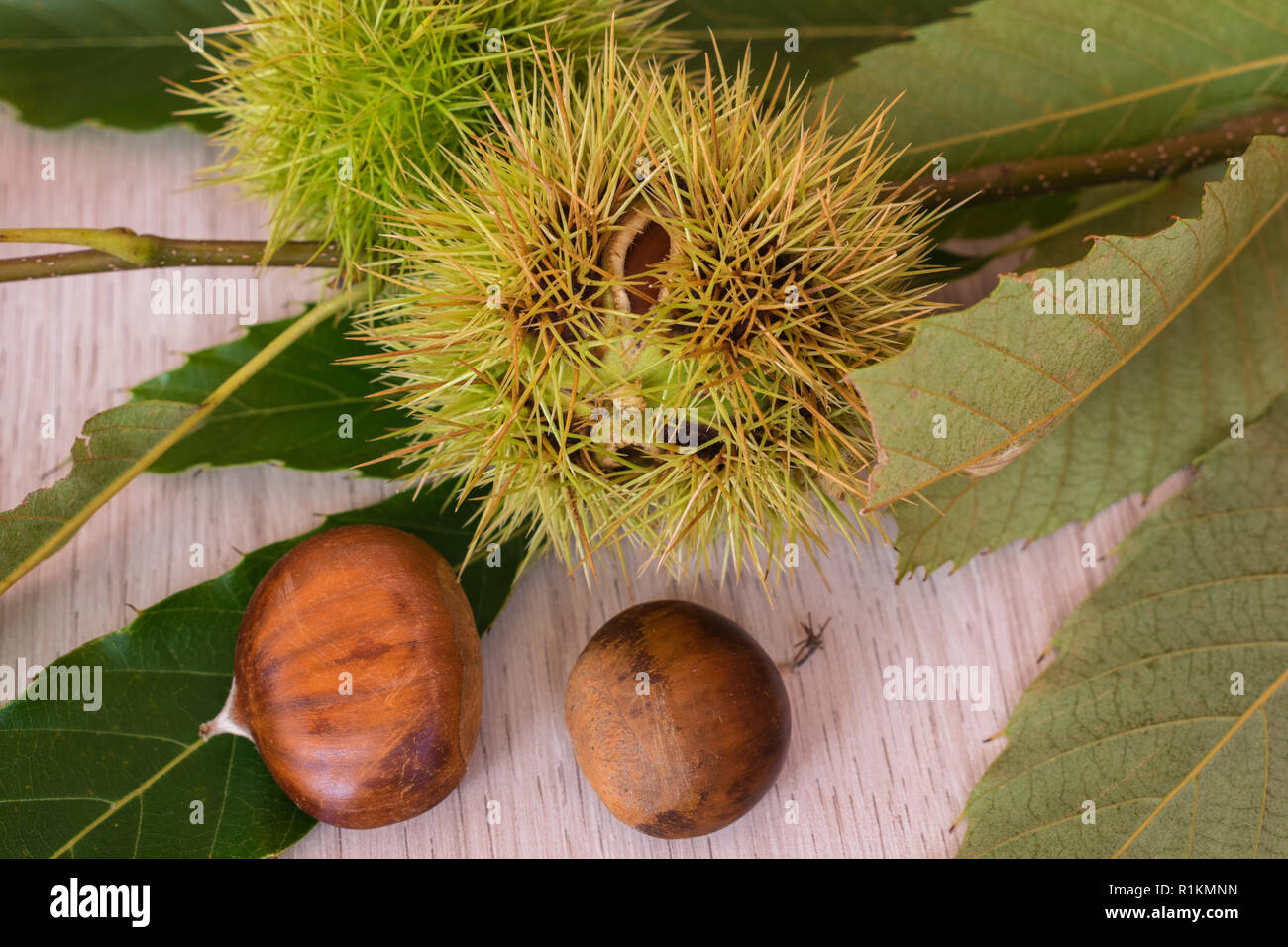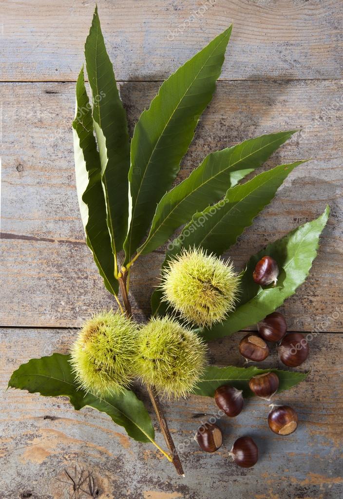 Riccio E Castagne Con Foglie Di Castagno Su Uno Sfondo Di Legno Foto Stock Alamy