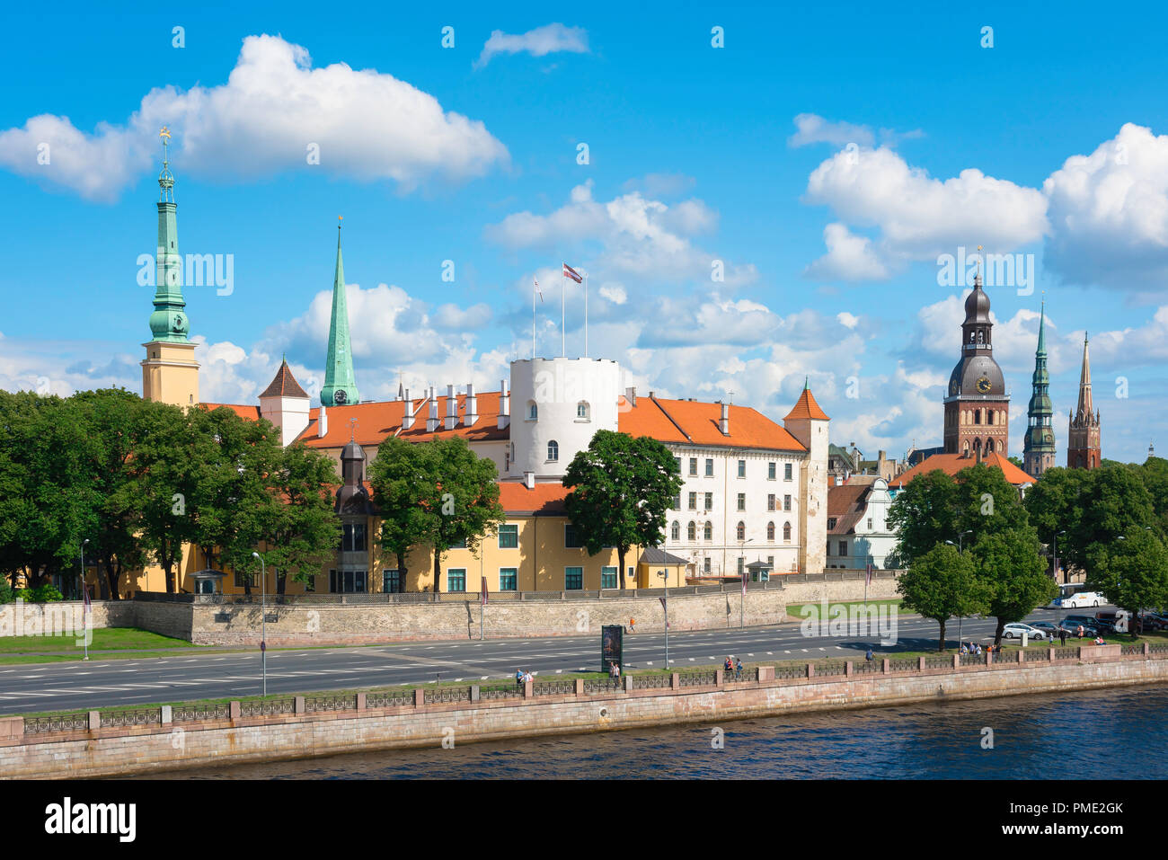 Riga Lettonia Skyline Vista In Estate Del Vecchio Castello Di Riga Lungo Il Fiume Daugava Con Le Guglie E Le Torri Della Citta Vecchia Medievale Al Di La Di Essa Lettonia Foto