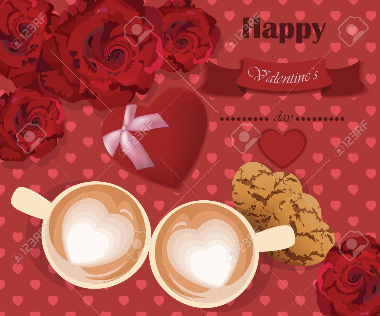 Vettoriale Le Rose Romantiche Amano Due Tazze Di Caffe Sulla Priorita Bassa Rossa Dei Cuori Image 69914267
