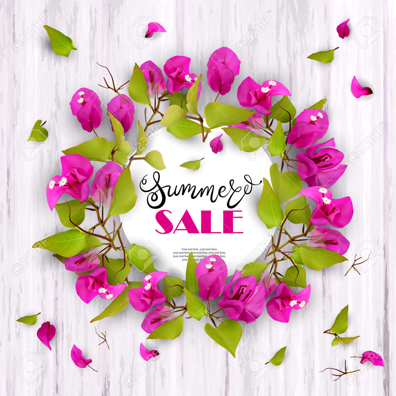 Vettoriale 3d Saldi Estivi Sconti Fine Della Stagione Pubblicita Sfondo Con Fiori Tropicali Bougainvillea E Lettering Contro Legno Bianco Image 77064654