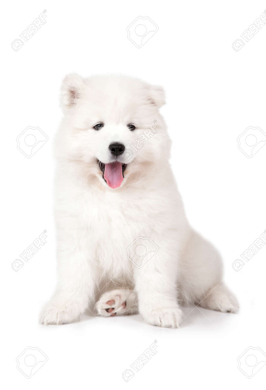 Immagini Stock Sette Mesi Di Eta Cucciolo Di Cane Samoiedo Isolato Su Sfondo Bianco Image 56597874