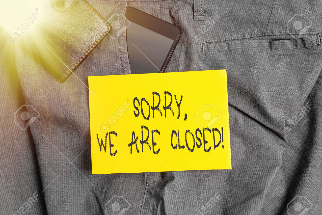 Immagini Stock Word Writing Text Sorry We Are Closed Business Photo Showcasing Apologize For Shutting Off Business For Specific Time Smartphone Device Inside Trousers Front Pocket With Wallet And Note Paper