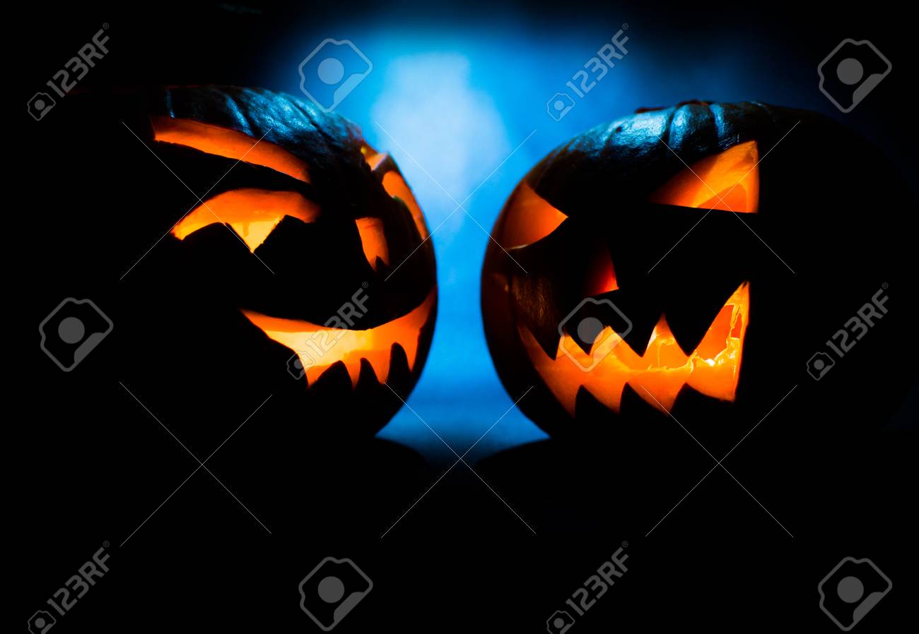 Immagini Stock Due Zucche Spaventose Di Halloween Su Una Priorita Bassa Blu Chiara Image 64329750