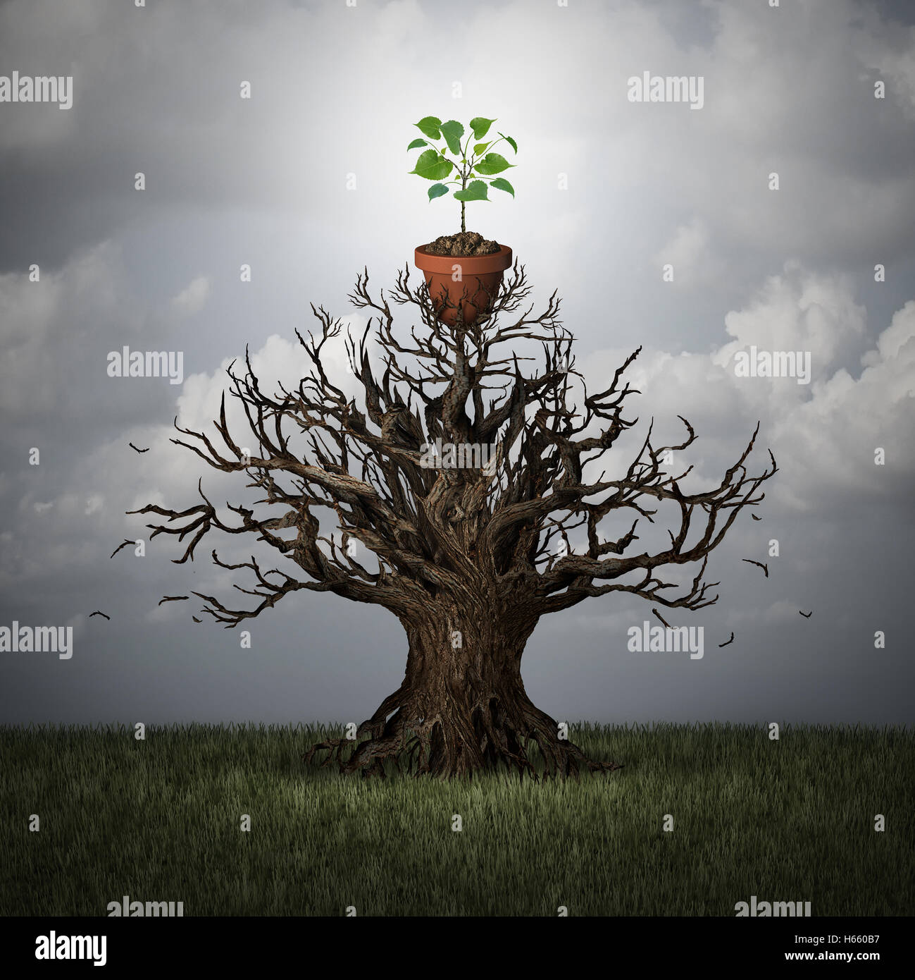 Sostenere Il Concetto Di Futuro E La Fondazione E Il Simbolo Trust Come Un Vecchio Albero Il Sollevamento Fino A Vasi Di Giovane Pianta Come Una Speranza Per Il Nuovo Business O