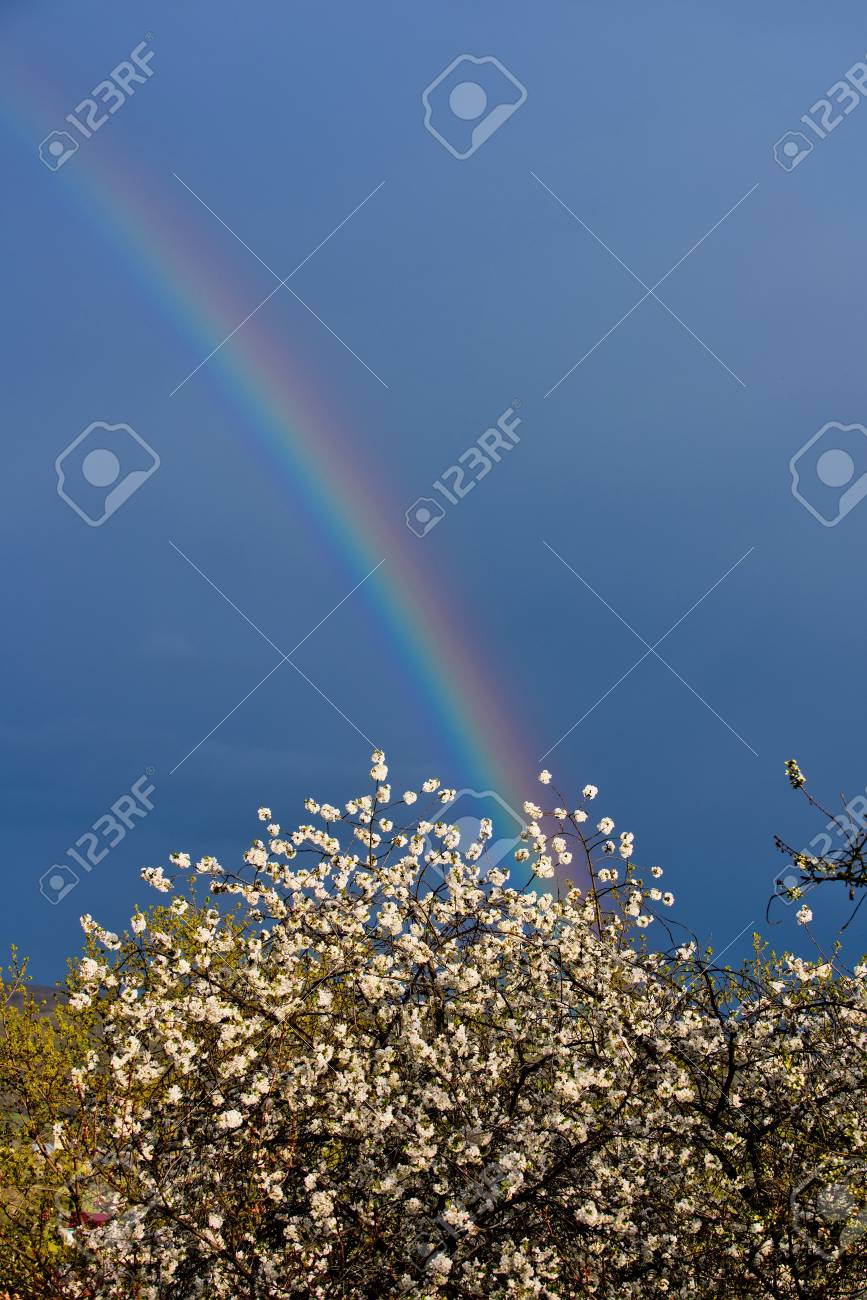 Immagini Stock Ecologia E Ambiente Liberta E Speranza Futuro E Infanzia Albero Di Fioritura Primaverile E Arcobaleno Fiore Bianco Fiore Sul Ramo Su Sfondo Blu Cielo Soleggiato Spazio Di Copia Image 78336546