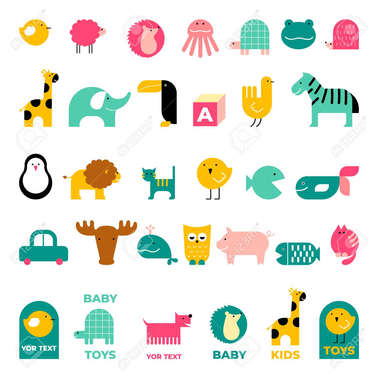 Vettoriale Insieme Di Vettore Di Caratteri E Simboli Stilizzati Bambini Balena Orso Riccio Giraffa Puo Essere Usato Come Logo Per Prodotti E Servizi Per Bambini Come Poster Invito Cartolina Image 97551560