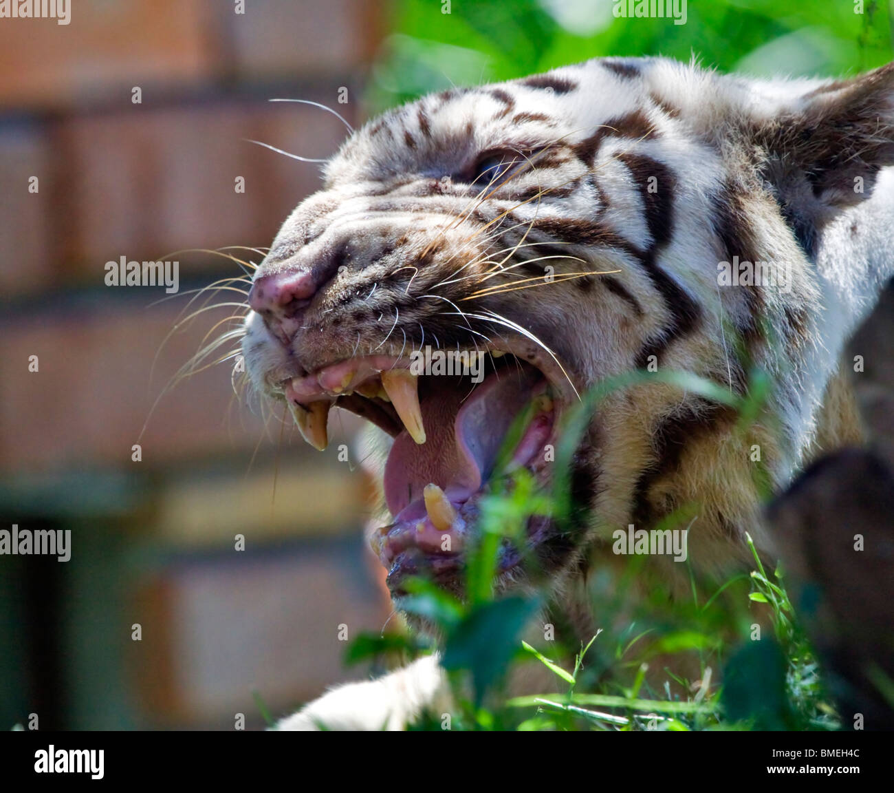 Primo Piano Di Un Ruggente Tigre Bianca Che Guarda Lontano Con Una Flora Verde Al Di Fuori Della Messa A Fuoco Lo Sfondo Foto Stock Alamy