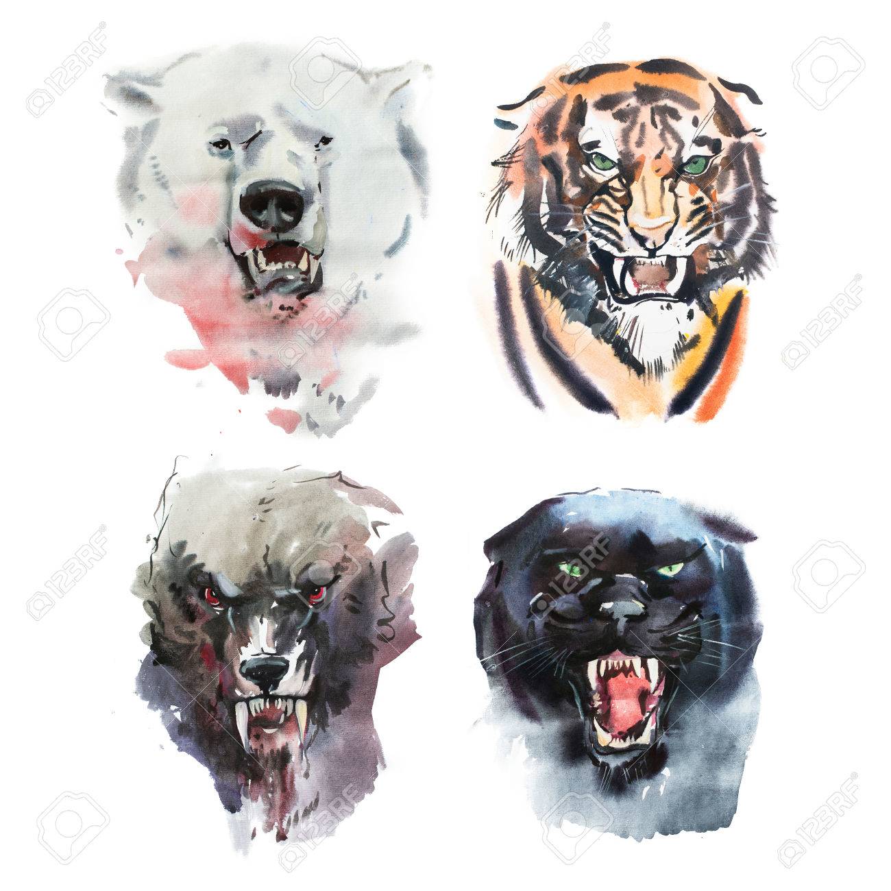 Immagini Stock Disegno Di Acquerello Di Orso Arrabbiato Tigre Lupo E Pantera Ritratto Di Animale Su Priorita Bassa Bianca Image 74718770