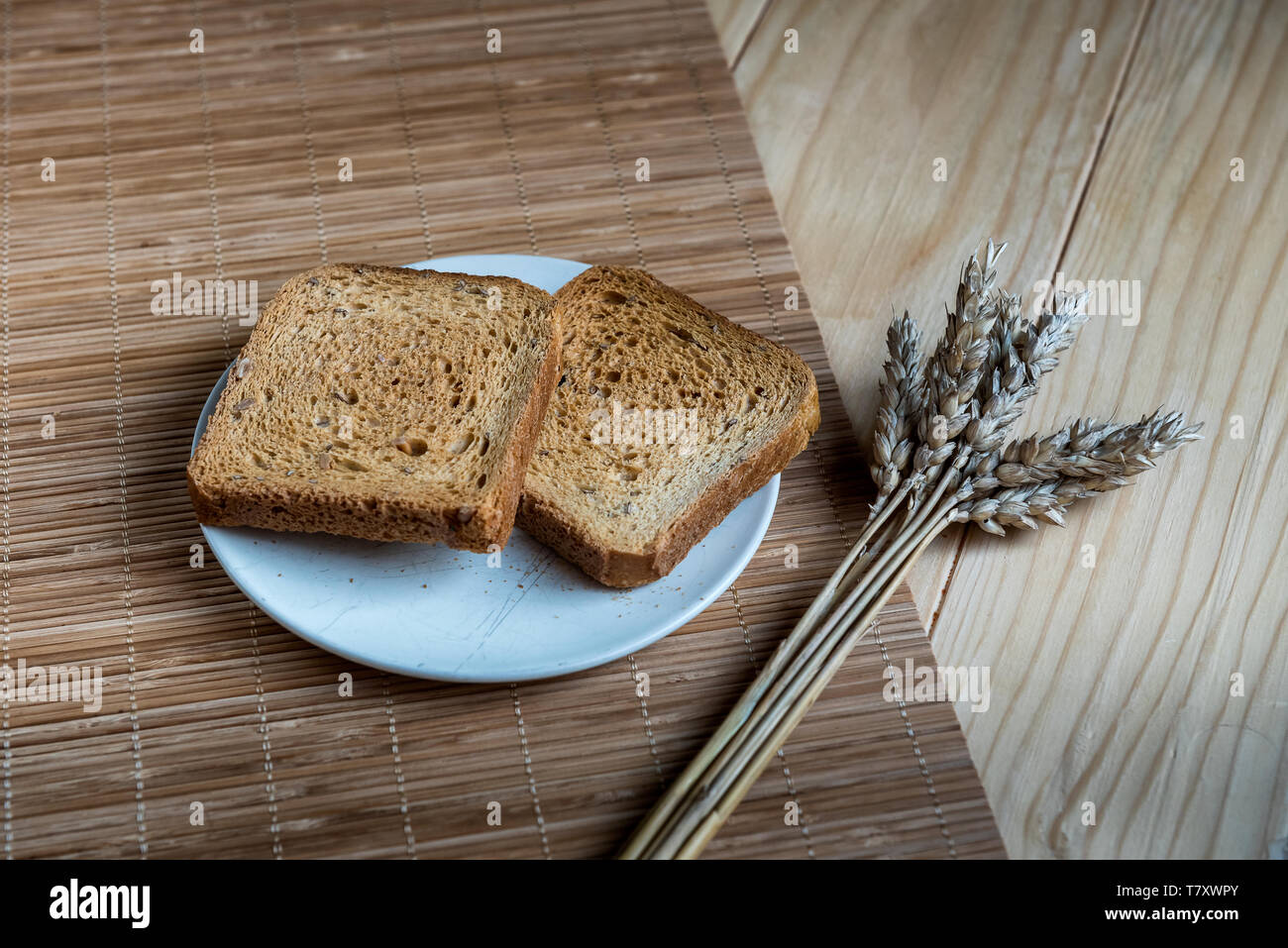 Two Slices Of Toast Bread And Ear Of Wheat On A Wooden Table Setup Stock Photo Alamy