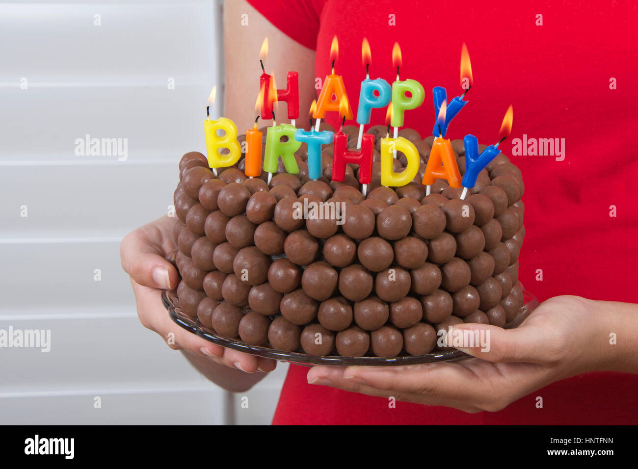 Ragazza Giovane Azienda Cioccolato Torta Di Compleanno Decorata Con Caramelle Palle Di Malto Di Fronte A Lei Con Buon Compleanno Candele Facile E Veloce Fatta In Casa Torta Foto Stock Alamy