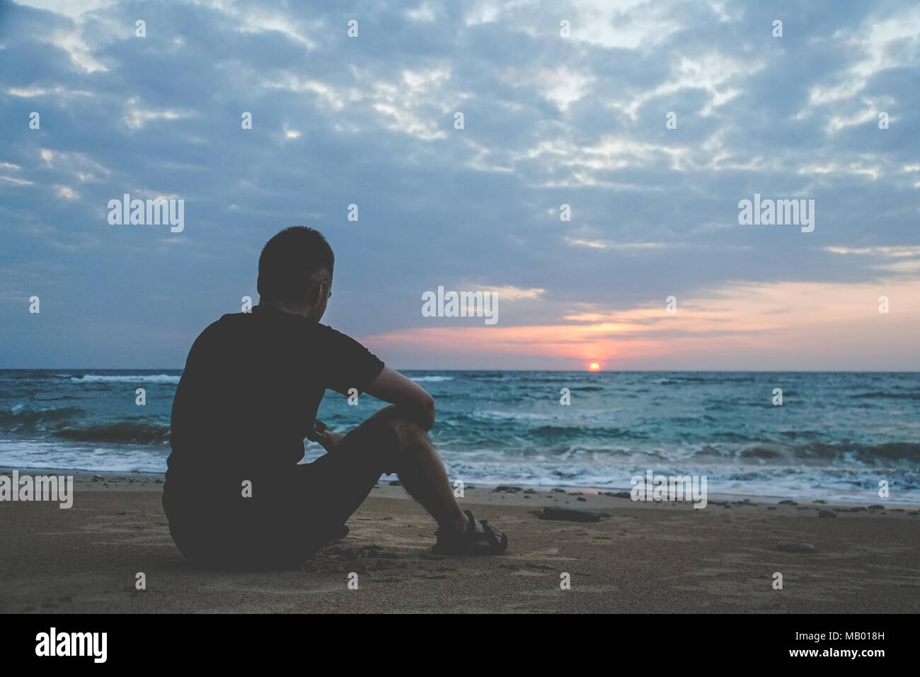 Rueful Dolorosi Luttuosi Siamo Spiacenti Infelice Malinconica Da Solo Uomo Guardando Il Tramonto Su Una Spiaggia Concetto Di Tristezza Solitudine Ansia E Depressione Foto Stock Alamy