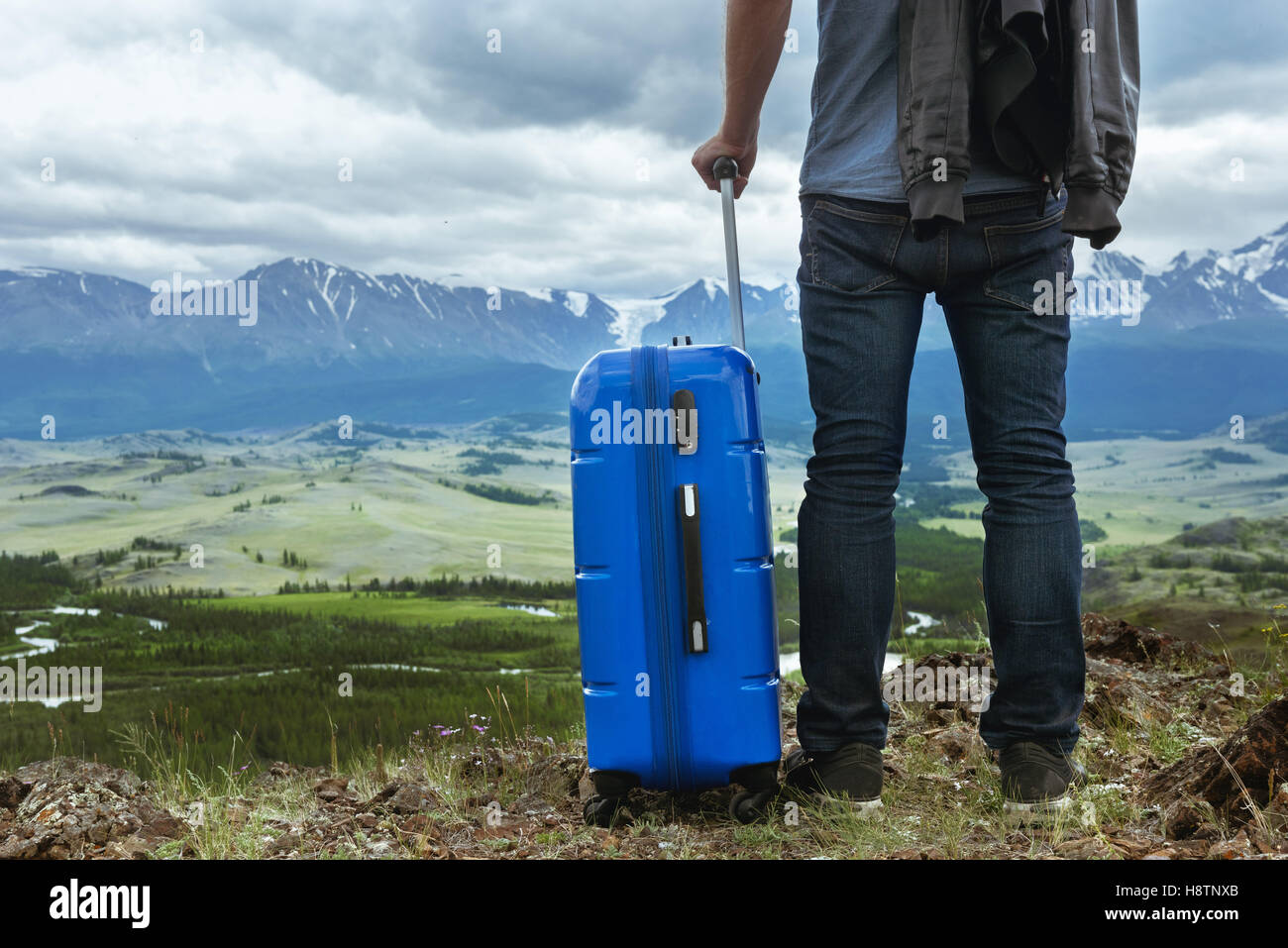 Uomo Con Valigia Montagne Concetto Di Viaggio Foto Stock Alamy