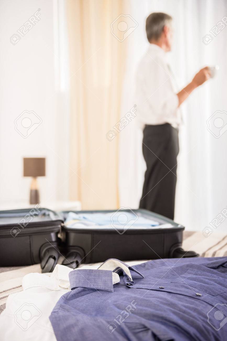 Immagini Stock Valigia E Vestiti Sul Letto Nella Camera D Albergo Vista Posteriore Di Uomo Con La Tazza Di Caffe Guardando La Finestra Image 42816147