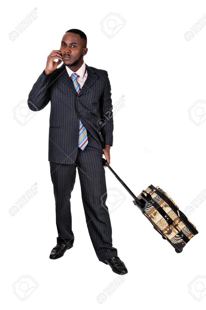 Immagini Stock Un Uomo D Affari Nero Con La Sua Valigia E In Piedi Per Bianca Una Tuta Blu E Parlando Al Telefono Image 25824325