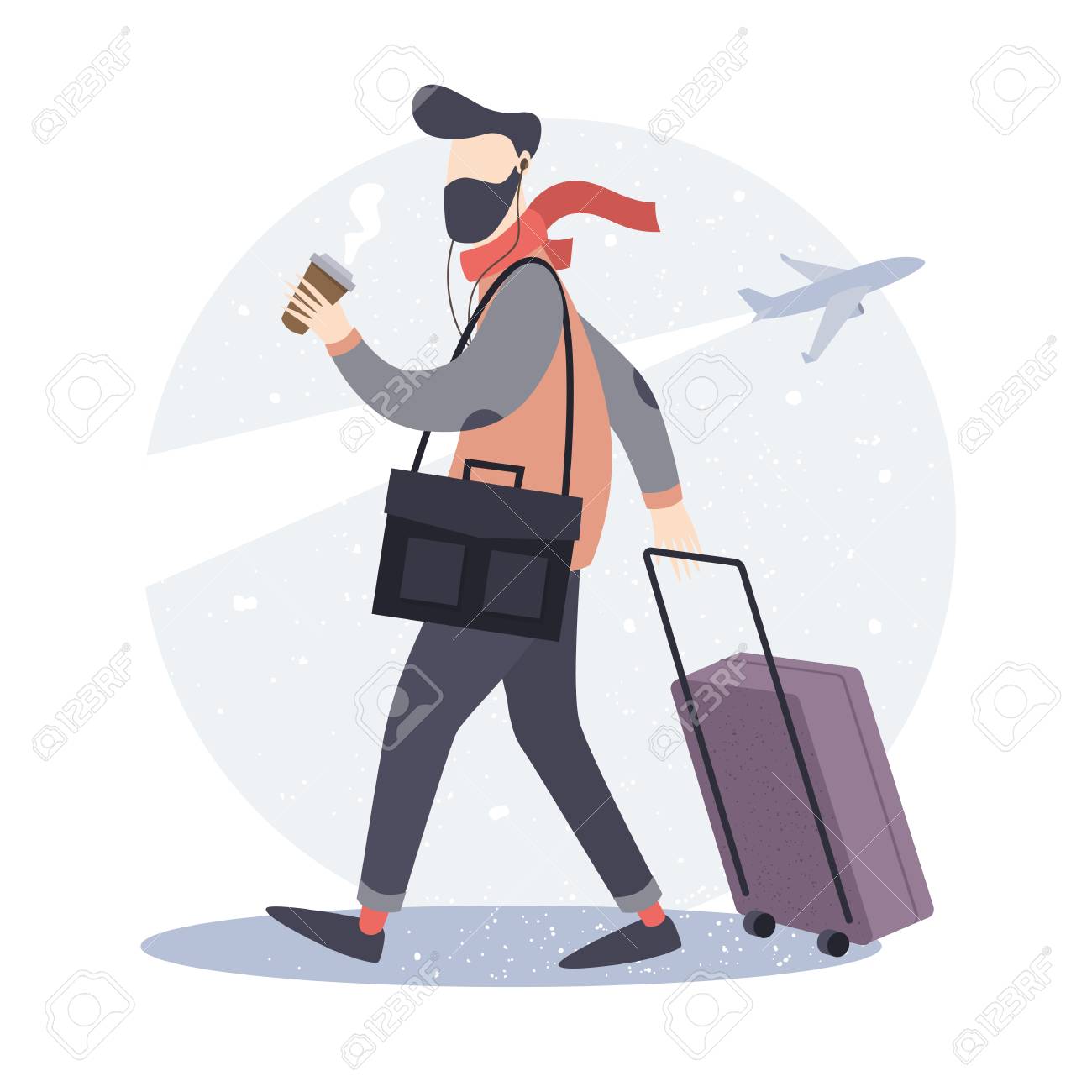 Vettoriale Tourist L Uomo Dei Pantaloni A Vita Bassa Con Una Valigia E Una Tazza Di Caffe Va All Aeroporto Illustrazione Vettoriale Image 70915160