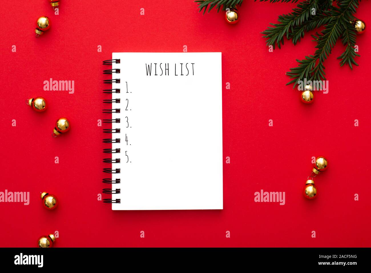 Notebook With Wish List On Red Background With Golden Christmas Decorations And Green Fir Tree Brunch Top View Stock Photo Alamy