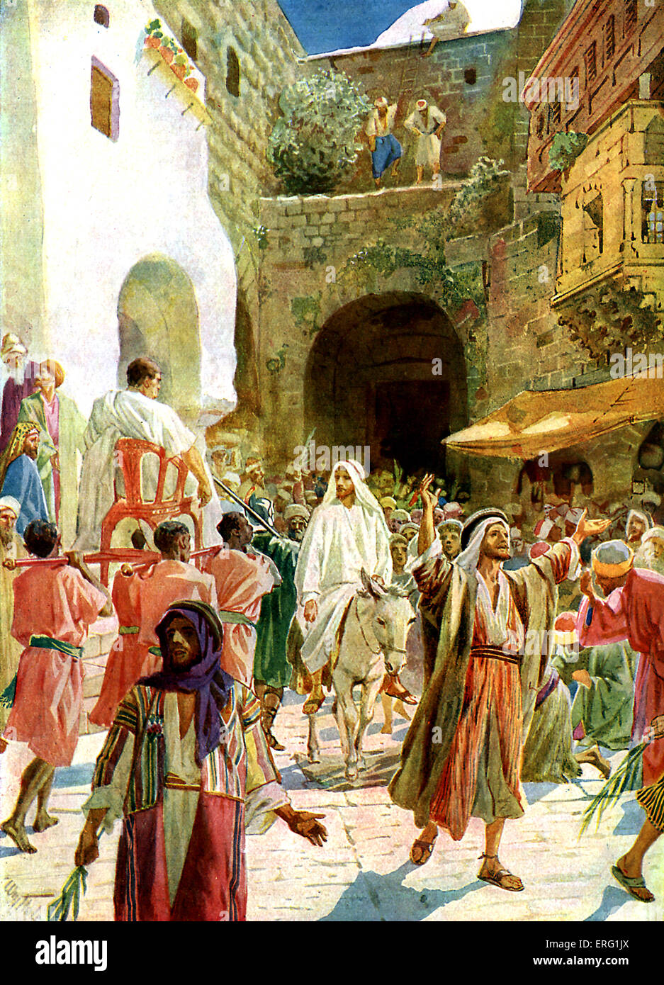 Entrata Di Gesu A Gerusalemme Su Un Asinello Bianco Ed E Lodato Dalla Folla E Le Moltitudini Che Sono Andato Prima E Che Ne E Seguita Foto Stock Alamy