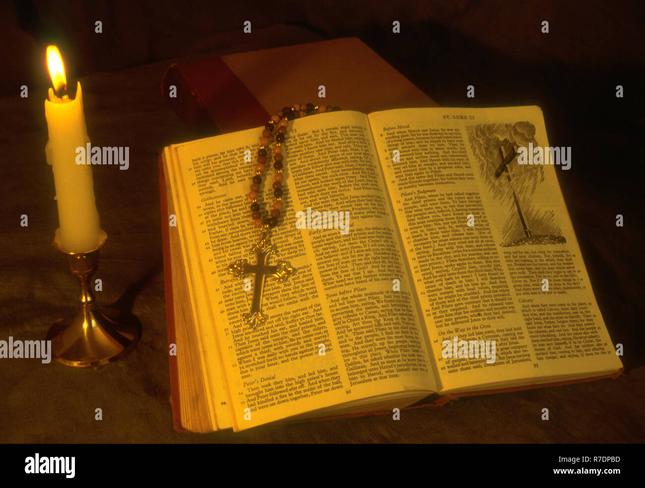 La Sacra Bibbia Rosario Croce Con Candela Che Brucia Accanto Foto Stock Alamy