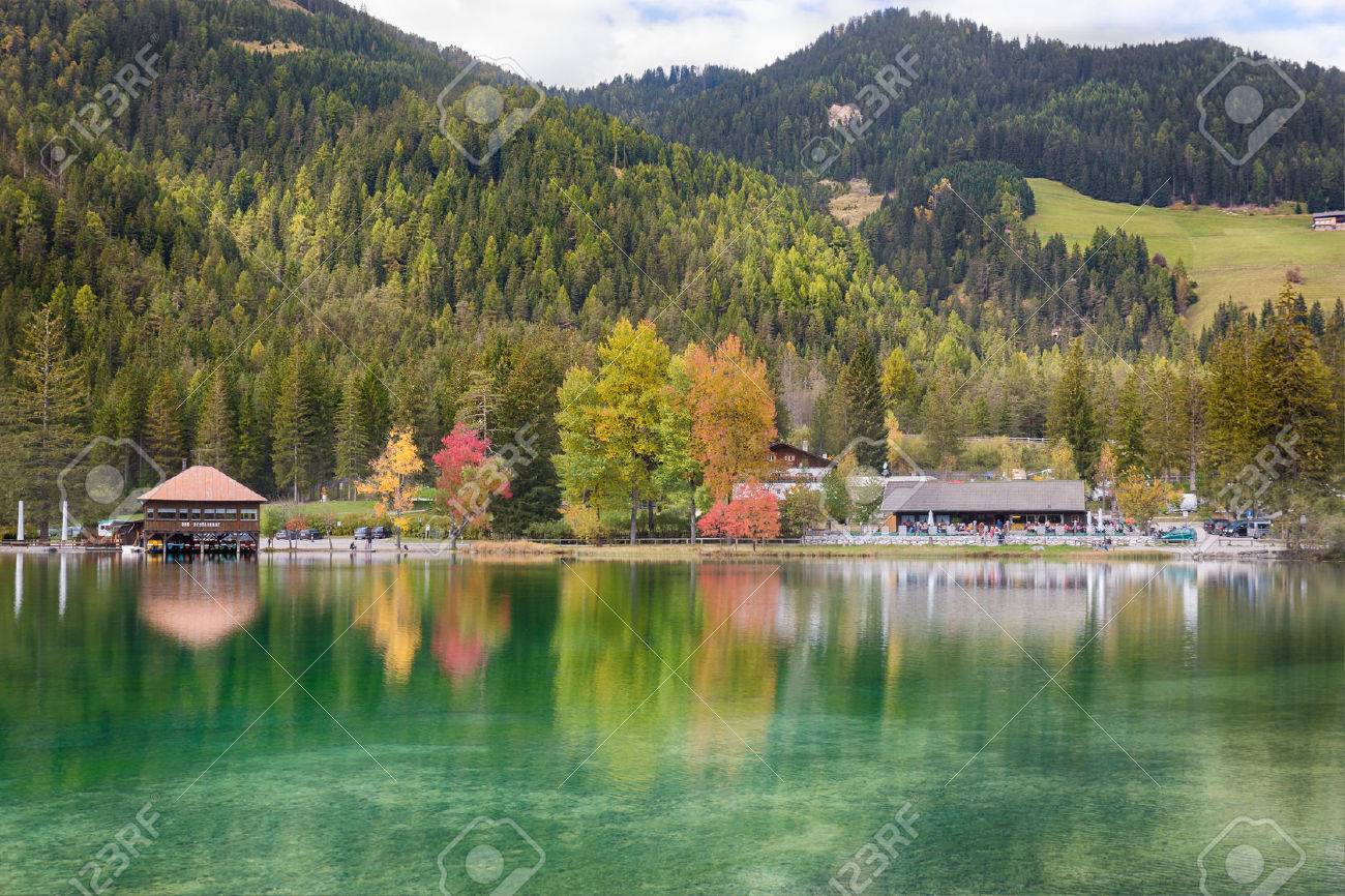Dobbiaco Lake Or Toblacher In Dolomites With Hotel Restaurant On Coast In Autumn Stock Photo Alamy