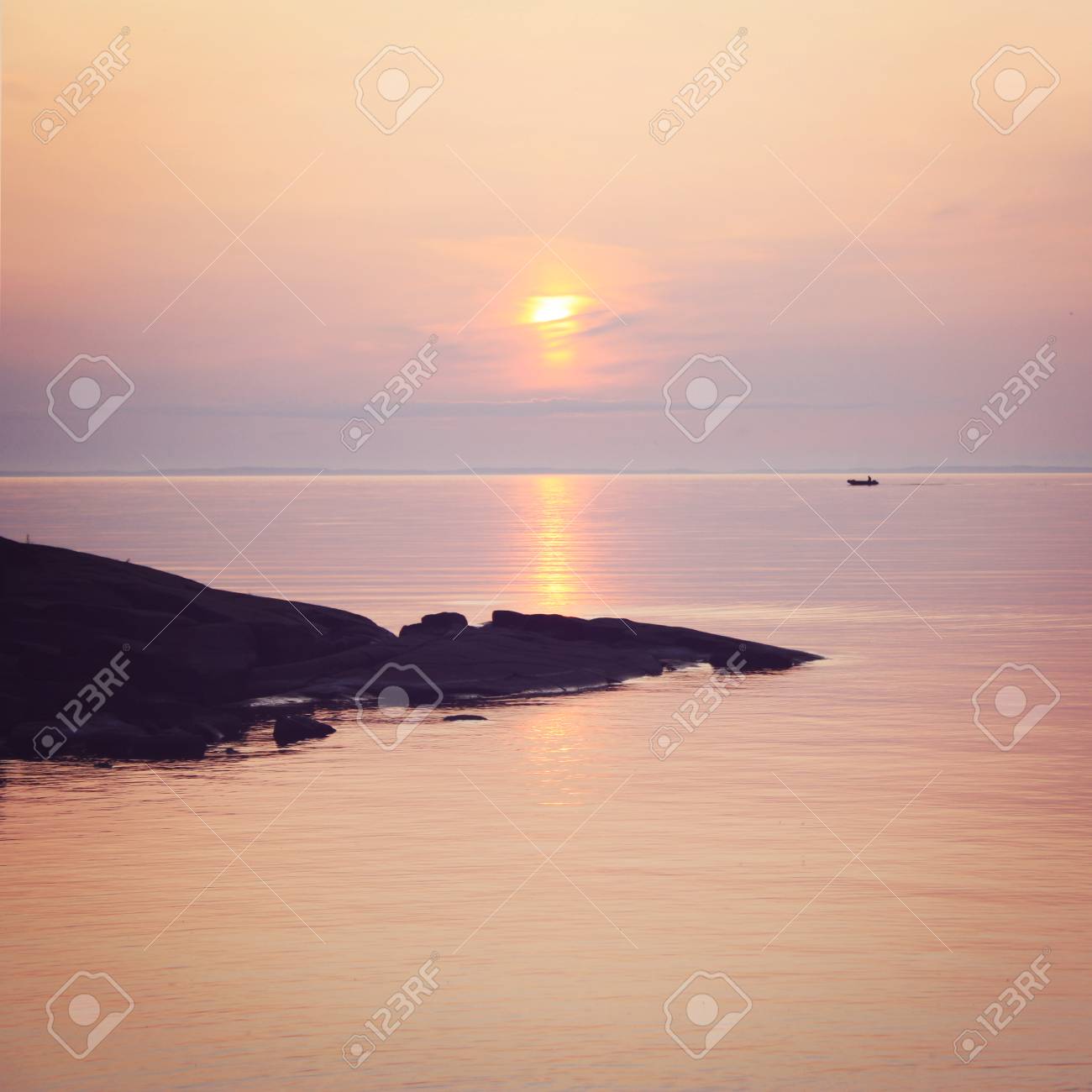 Immagini Stock Lago Di Sera Con Una Barca All Orizzonte Lago Ladoga Al Tramonto Foto Invecchiata In Stile Retro Profilo Della Nave Immagine Tonica Acque Calme Crepuscolo Isola Di Valaam Carelia Russia