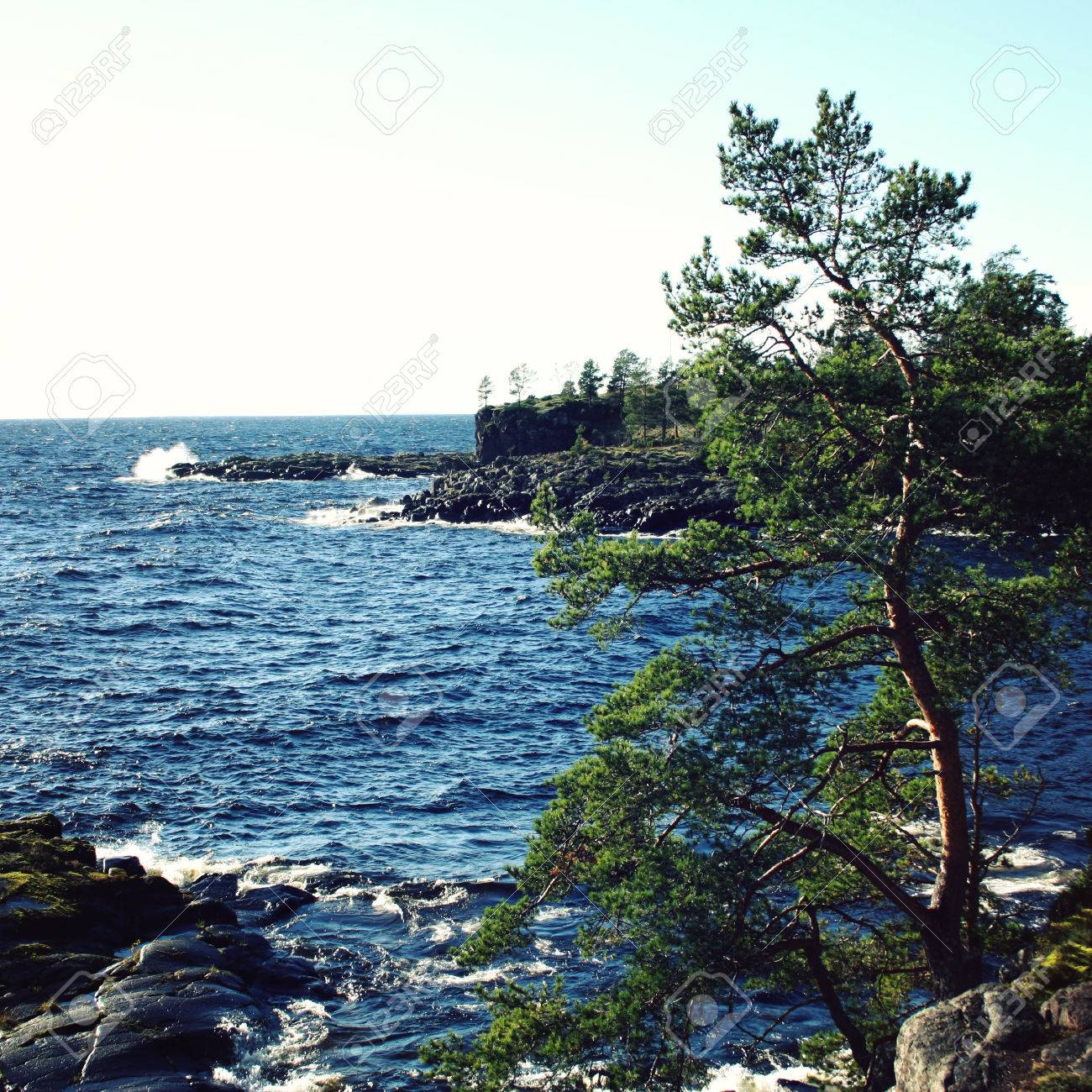 Immagini Stock Lago E Pini Bel Paesaggio Nordico Lago Ladoga Foto Invecchiata In Stile Retro Isola Di Valaam Repubblica Di Karelya Russia Image 66928155