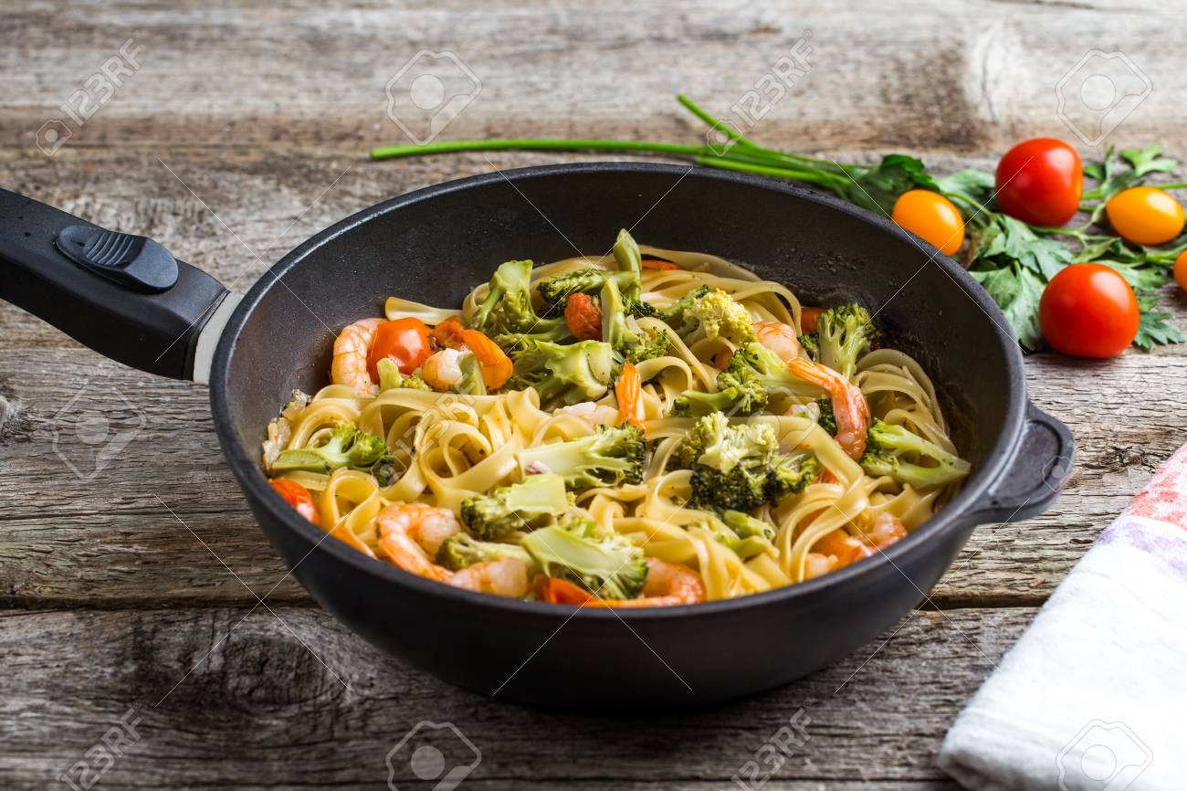 Immagini Stock Linguine Pasta Con Gamberetti E Broccoli In Leccarda Su Fondo In Legno Vista Dall Alto Image 66436906