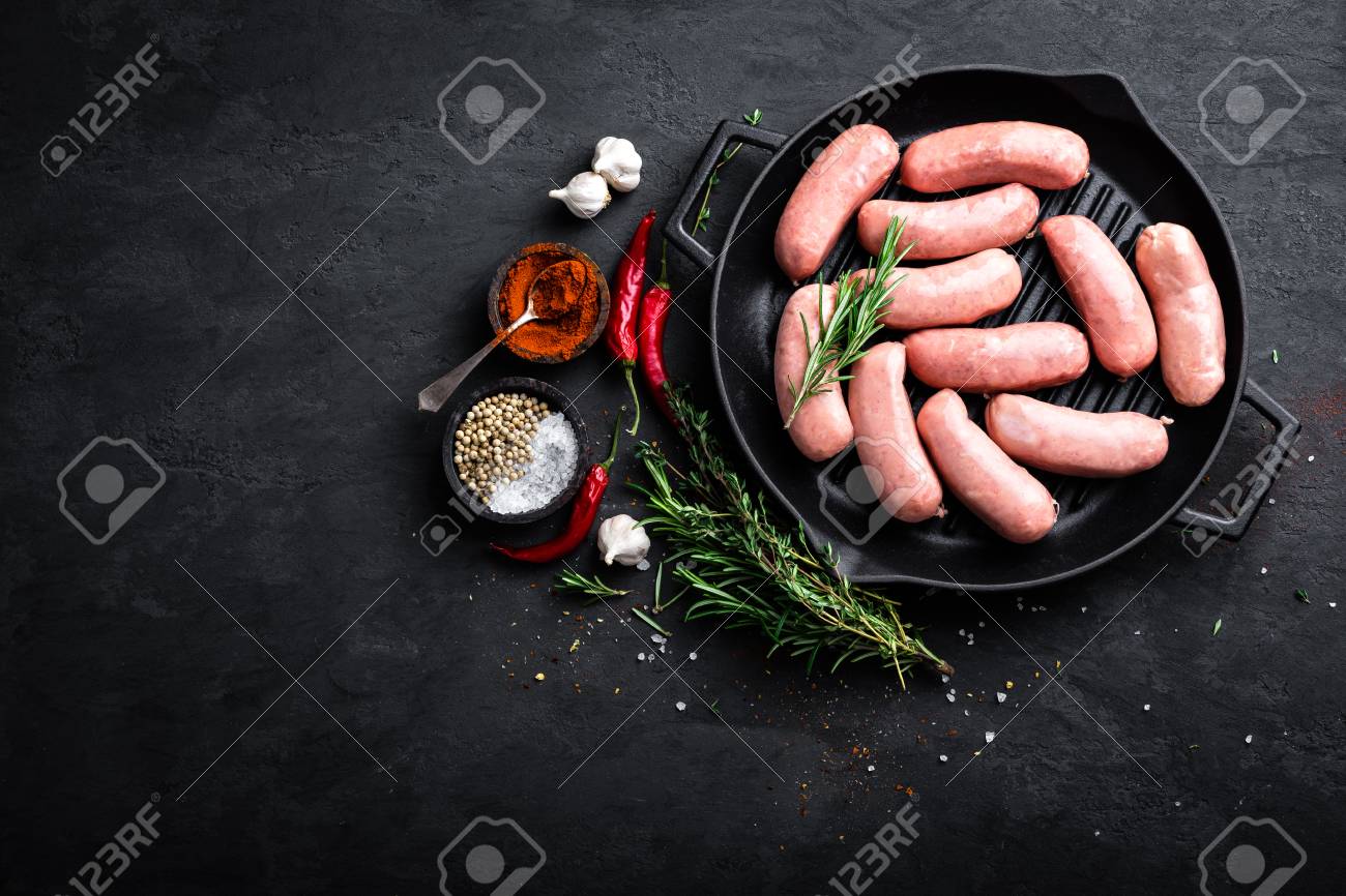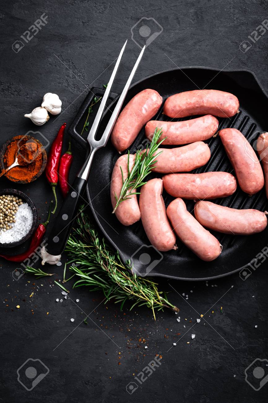 Immagini Stock Salsiccie Grezze Fresche Su Una Leccarda Su Una Priorita Bassa Nera Vista Superiore Della Ghisa Image 92111282
