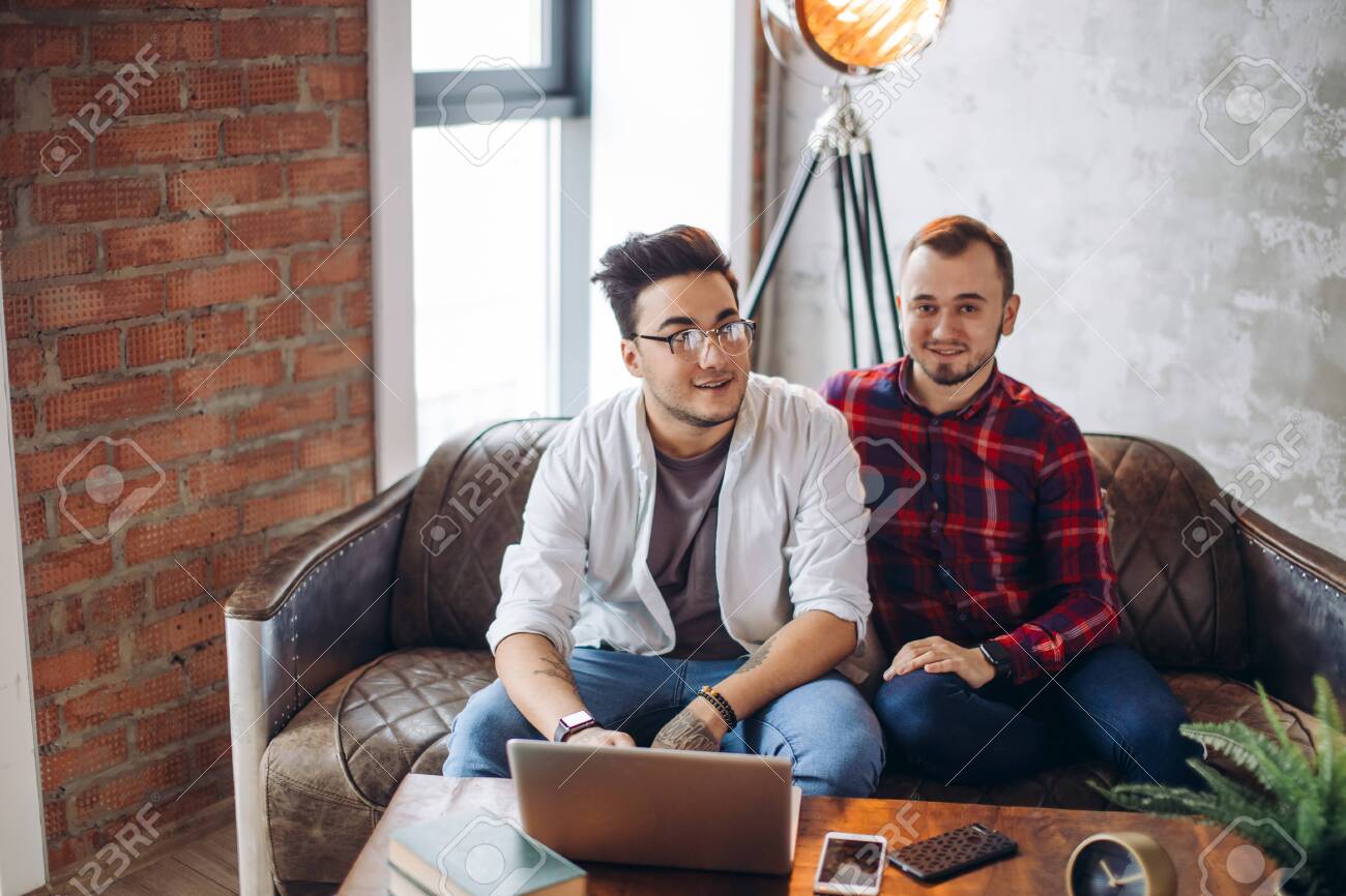 Immagini Stock Two Handsome Young Caucasian Mates Cooperate For Making Common Project Using Laptop Talk With Each Other Business Team Work And Cooperation Concept Image 152453222