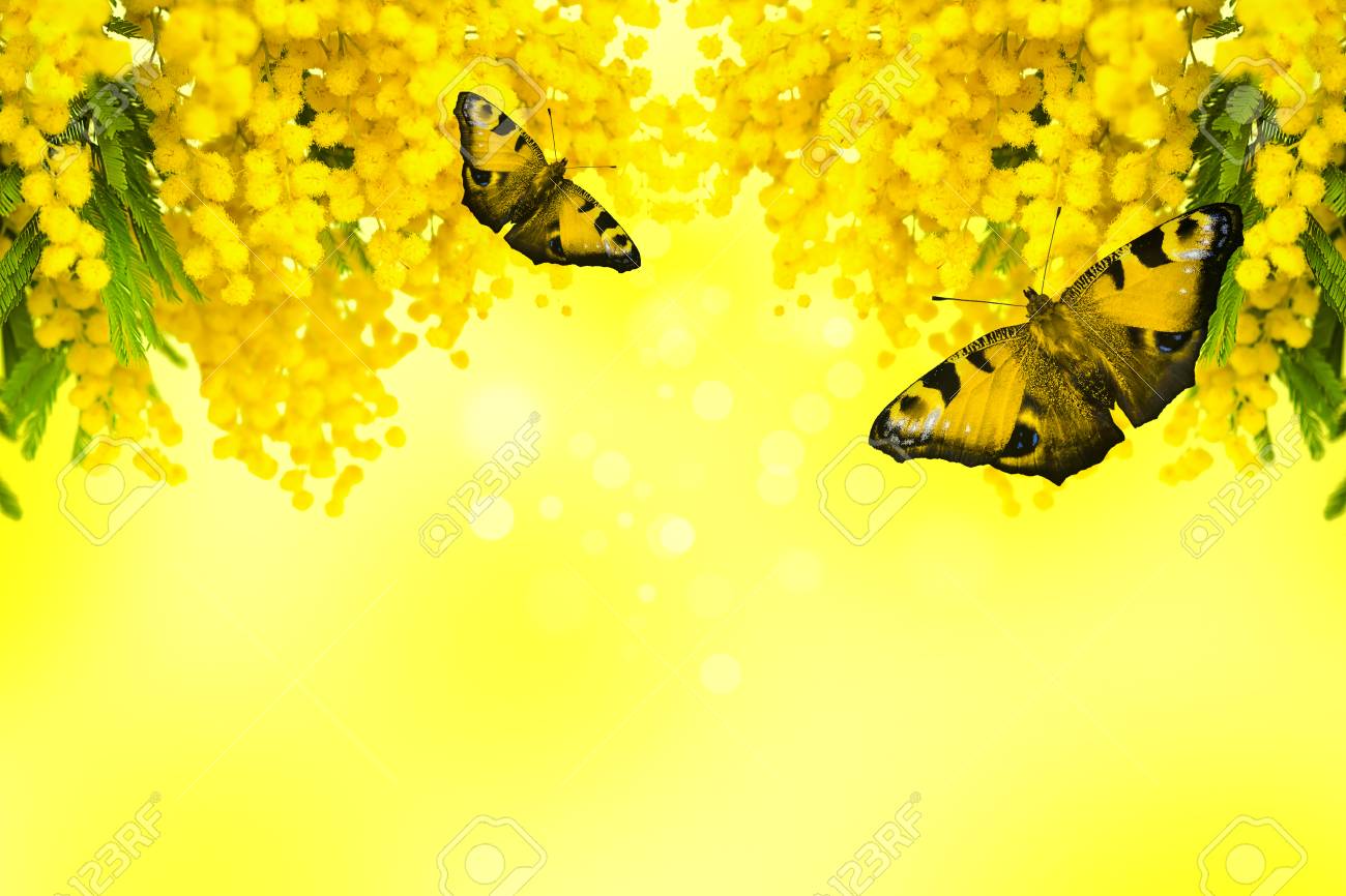 Immagini Stock Fiore Del Fiore Del Mimosa Con La Farfalla Su Priorita Bassa Gialla Cornice Di Auguri Profondita Di Shellow Image 76550539