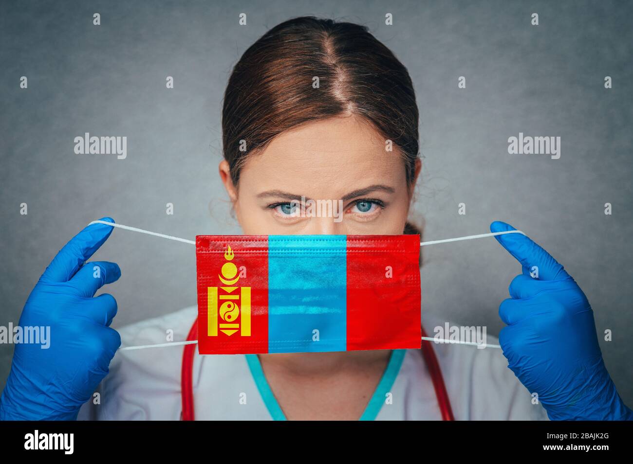 Coronavirus In Mongolia Female Doctor Portrait Hold Protect Face Surgical Medical Mask With Mongolia National Flag Illness Virus Covid 19 In Mongoli Stock Photo Alamy
