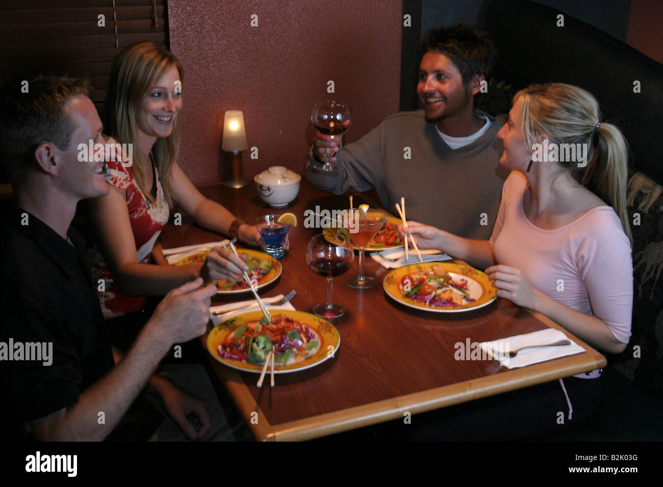 Group Of 4 Friends 2 Couples Having Dinner At Japanese Mongoli Grill Stock Photo Alamy