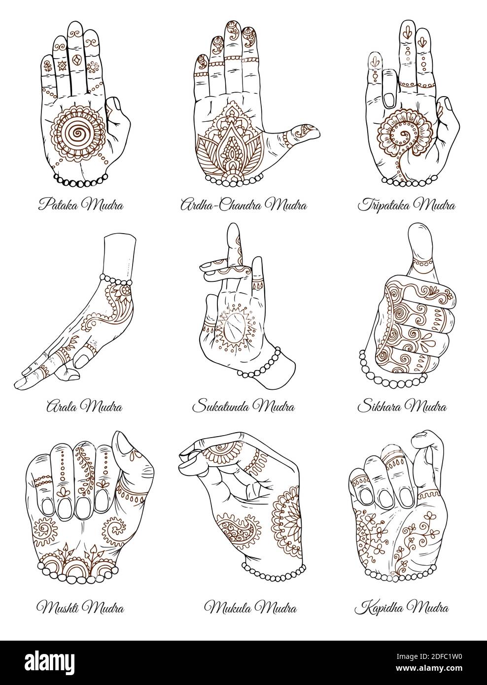 Immagini Stock Raccolta Disegnata A Mano Con Mudra Su Due Mani Su Sfondo Testurizzato Mudra Con I Modelli Henne Mehndi Sulle Mani Ornamento Etnico Etnico Image 79013132