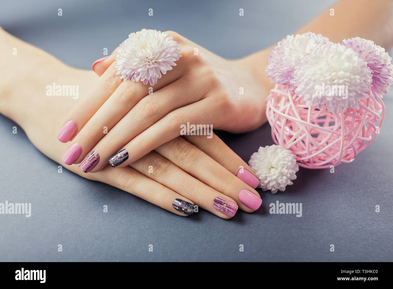Pink And Black Manicure With Flowers On Grey Background Nail Art Fotografie Stock E Altre Immagini Di Accudire Istock