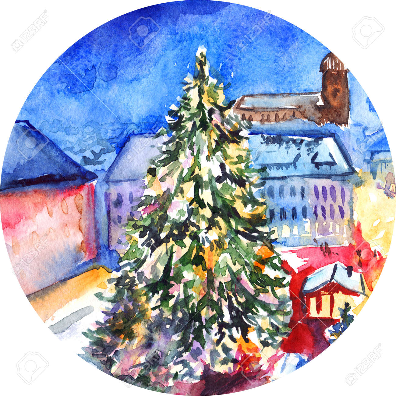 Immagini Stock Albero Di Natale Acquerello In Opere D Arte Piazza Della Citta Image 66754384