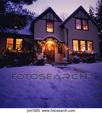 Inglese Tudor Style Casa Con Neve E Natale Decorations Proprieta Released Archivio Fotografico Jmt1025 Fotosearch