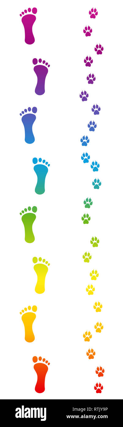 Impronte Di Cane E A Piedi Scalzi Padrone Umano Andare A Fare Una Passeggiata Rainbow Orme Colorate Illustrazione Su Sfondo Bianco Foto Stock Alamy