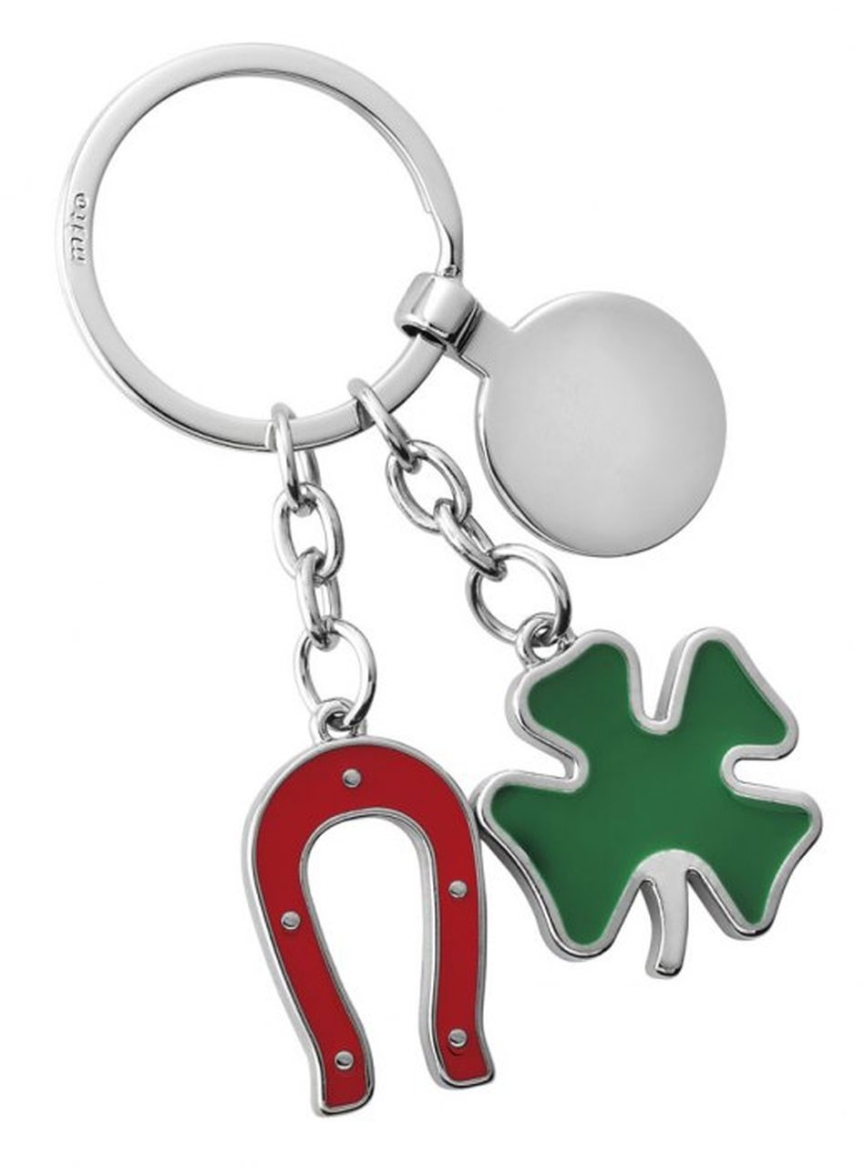 Uomo Bomboniera Gadget Portafortuna Portachiavi Quadrifoglio Verde Ferro Di Cavallo Rosso Con Gettone Portafortuna