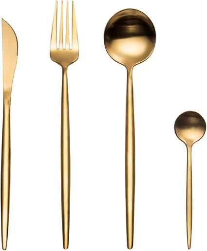 Cvthfyky 304 Acciaio Inossidabile Posate Cucchiaio Disegno Stile Spessore Titanio Coltelli Da Bistecca E Forchette Montati Famiglia Di Quattro Colore Oro Amazon It Casa E Cucina