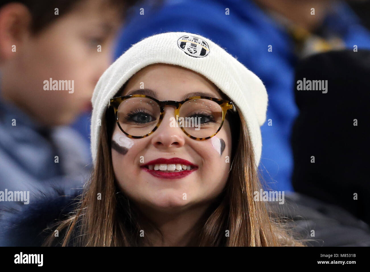 Torino Italia Xiv Mar 2018 Il 14 Marzo 2018 Allianz Stadium Torino Italia Di Calcio Della Serie A Juventus Versus Atalanta Una Giovane Ragazza Tifosi Della Juventus Sorride Dopo La Partita Di