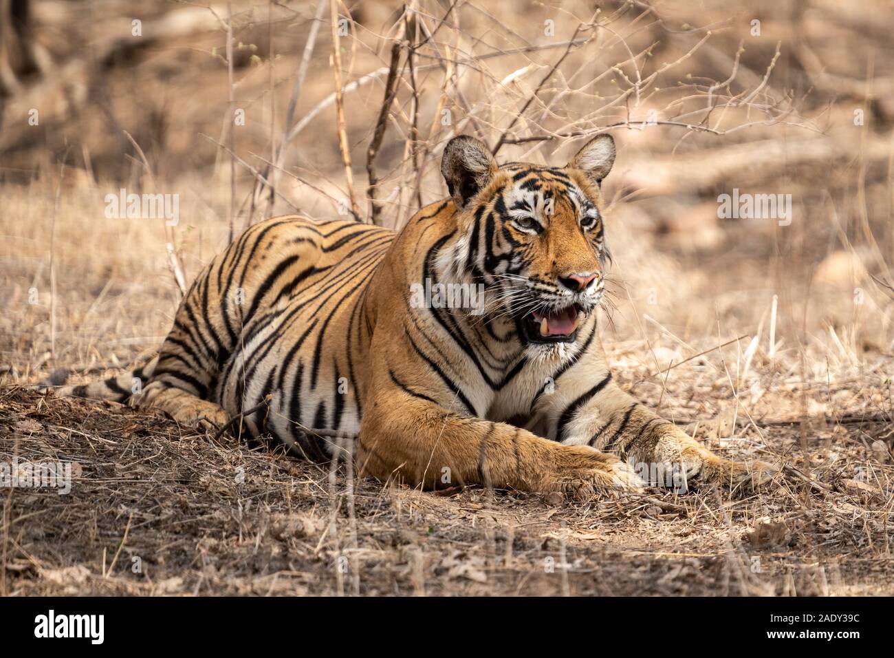 Wild Female Tiger Resting In Dry Forest During Hot Summers In Evening Safari At Ranthambore National Park Rajasthan India Panthera Tigris Tigris Stock Photo Alamy
