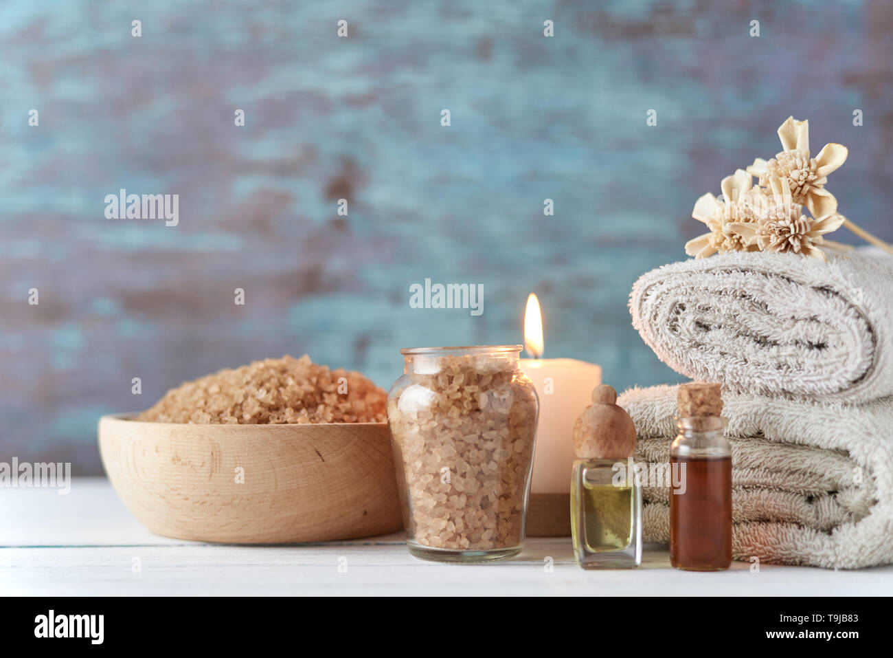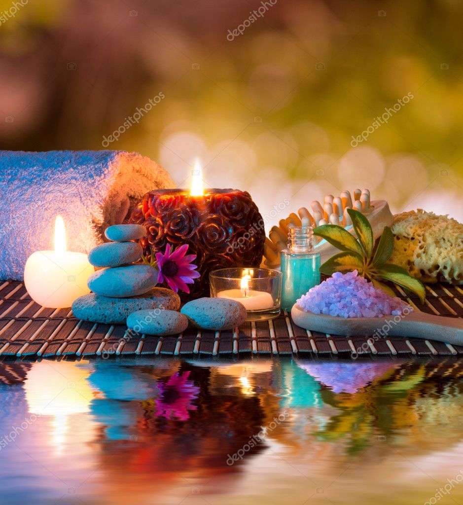 Spa And Relax Composition With Massage Oil Towels And Burning Candle Stock Photo Alamy