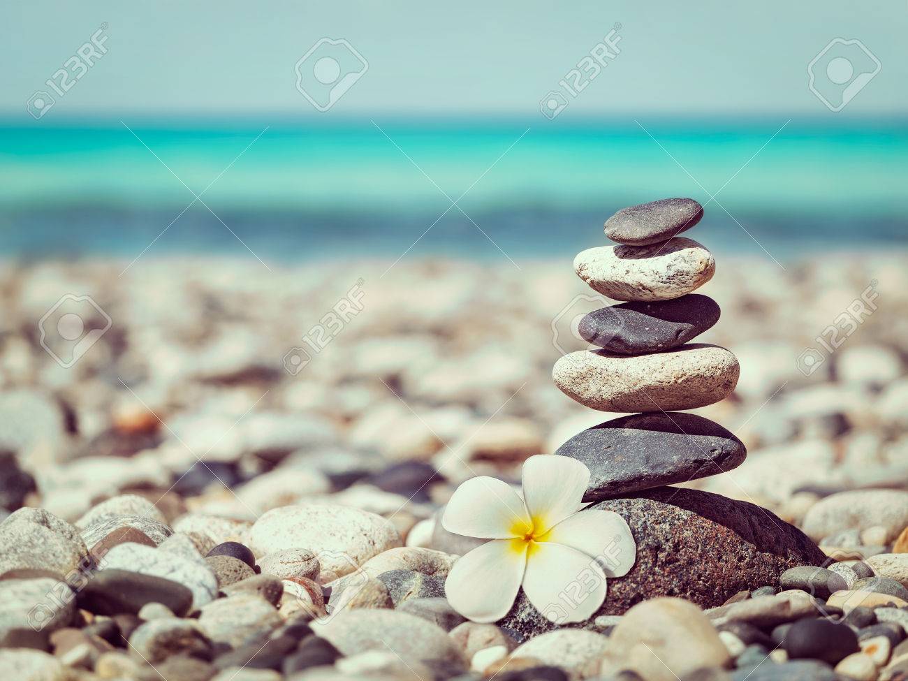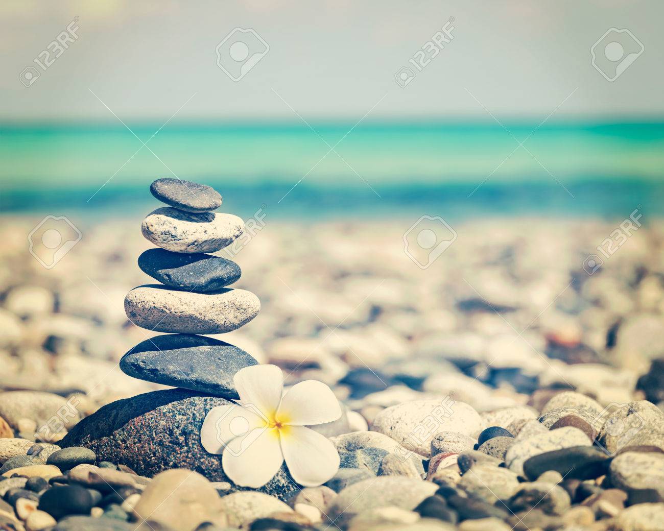 Immagini Stock Meditazione Zen Spa Relax Sfondo Effetto Filtrato Immagine D Epoca Stile Retro Pantaloni A Vita Bassa Di Pietre In Equilibrio Pila Con Frangipani Plumeria Fiore Da Vicino Sulla Spiaggia