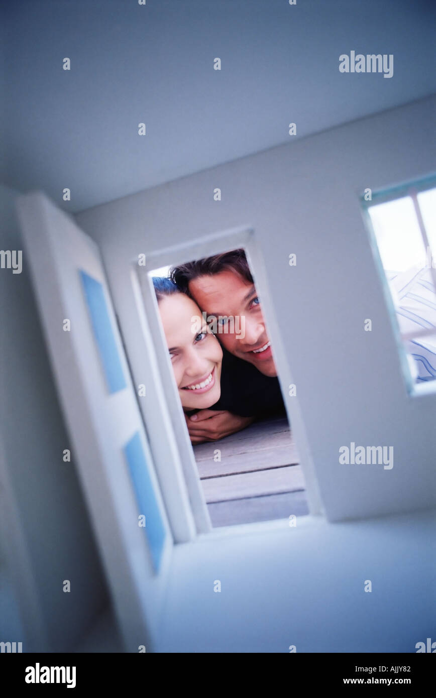 Coppia Alla Ricerca Attraverso La Porta Di Casa Di Bambola Foto Stock Alamy