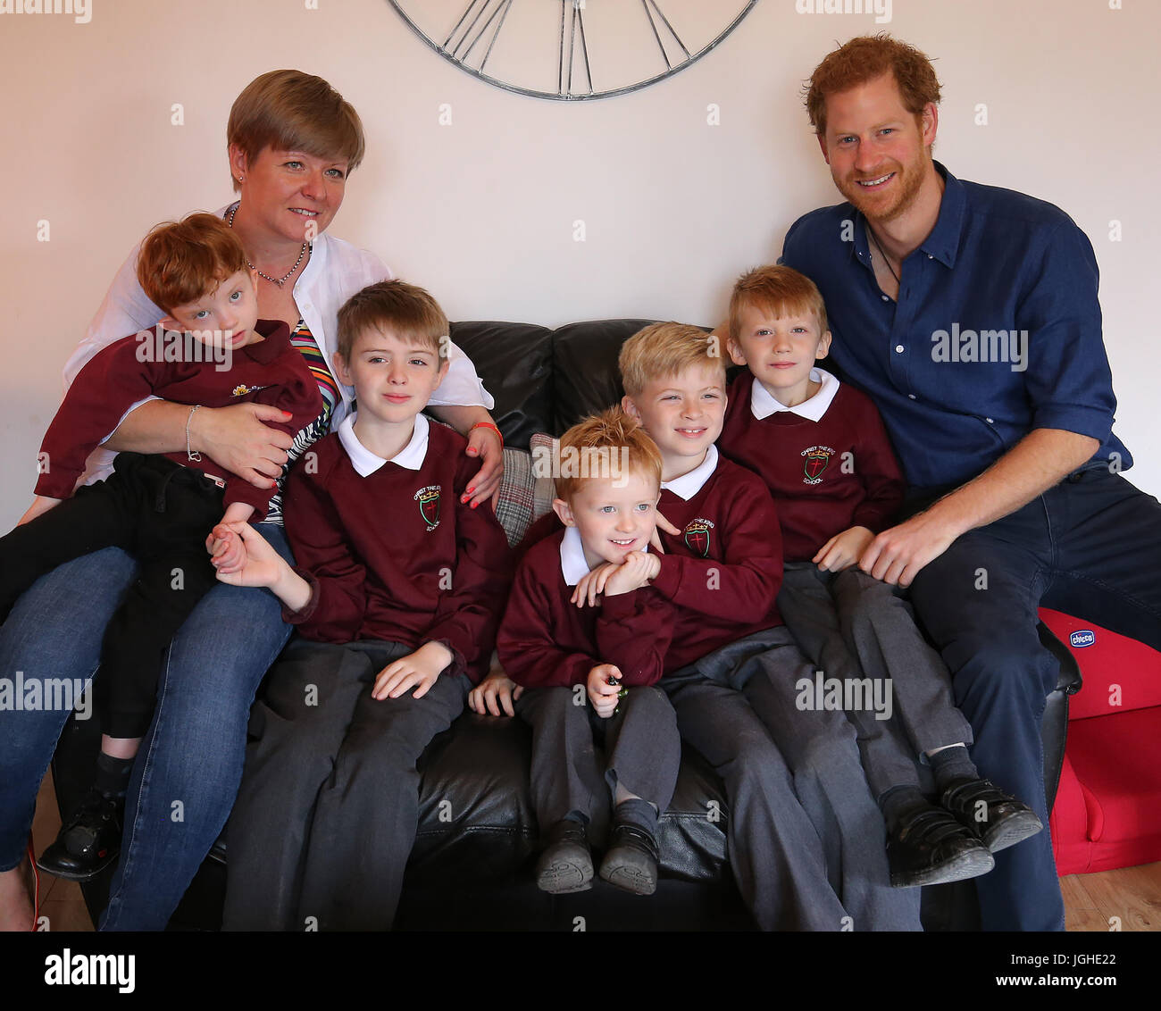 Il Principe Harry Incontra Oliver Rooney Sinistra Che Ha Wolf Hirschhorn Sindrome Con Sua Mamma Elisabetta E Fratelli Sinistra Destra Non Dato Samuel Jack Giuseppe E Thomas In Casa Loro A Bramley Nel Secondo