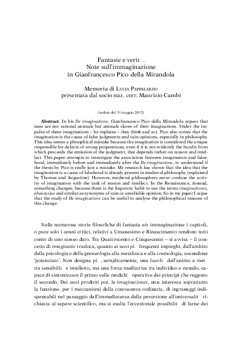 Pdf Fantasie E Verita Note Sull Immaginazione In Gianfrancesco Pico Della Mirandola Lucia Pappalardo Academia Edu