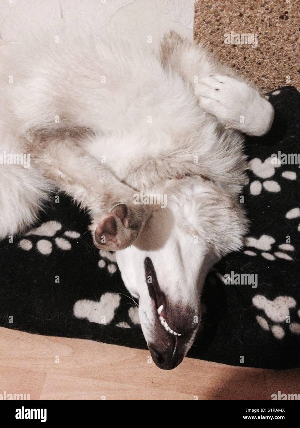 Divertenti Cane Bianco Dormire Con La Sua Testa Pendere Dalla Sua Zampa Cuscino Stampato Foto Stock Alamy