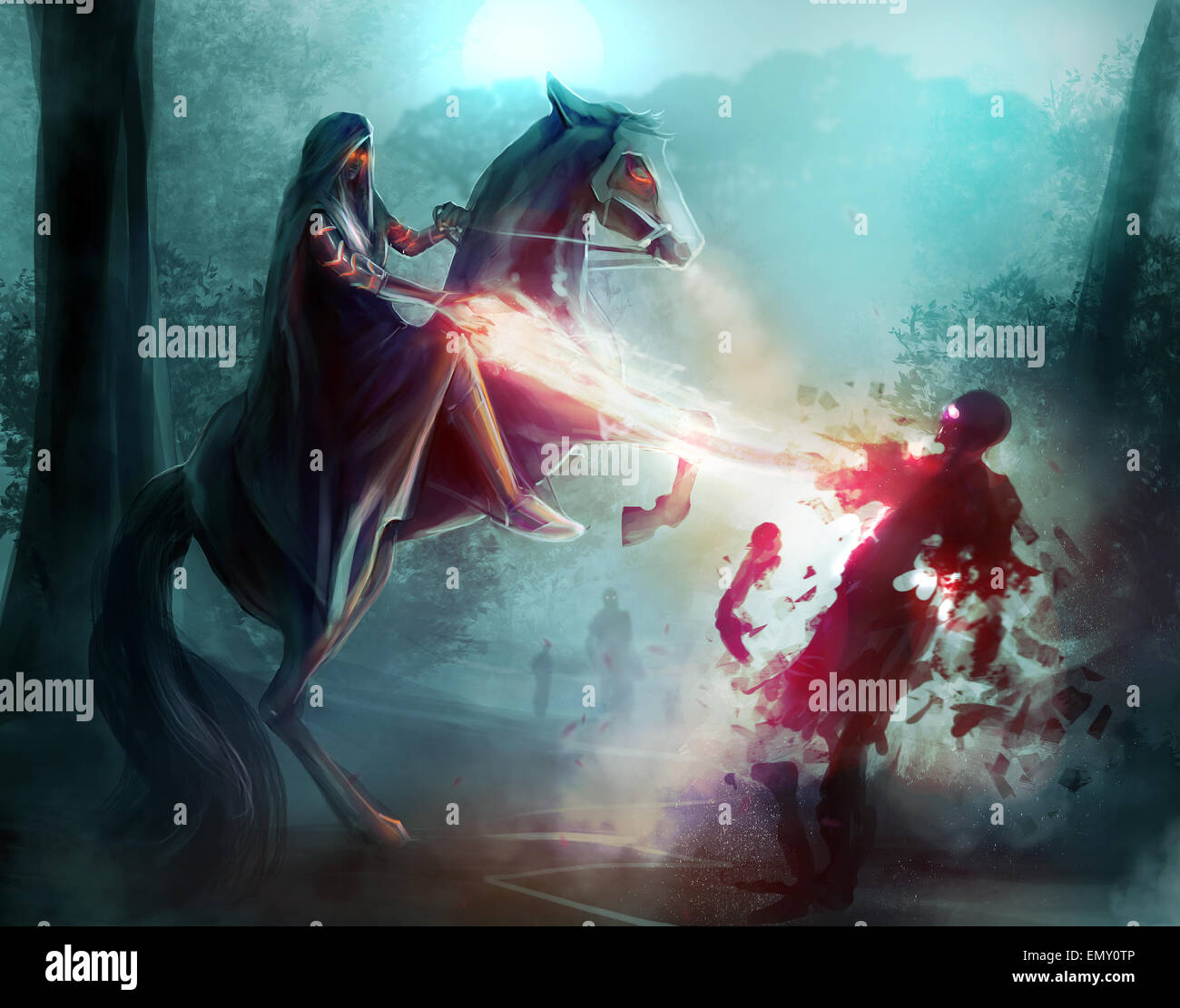 Fantasy Horseman Stregoneria Fantasy Cavaliere In Una Cappa Combattere Gli Zombie In Legno Scuro Con Una Stregoneria E Magia Foto Stock Alamy