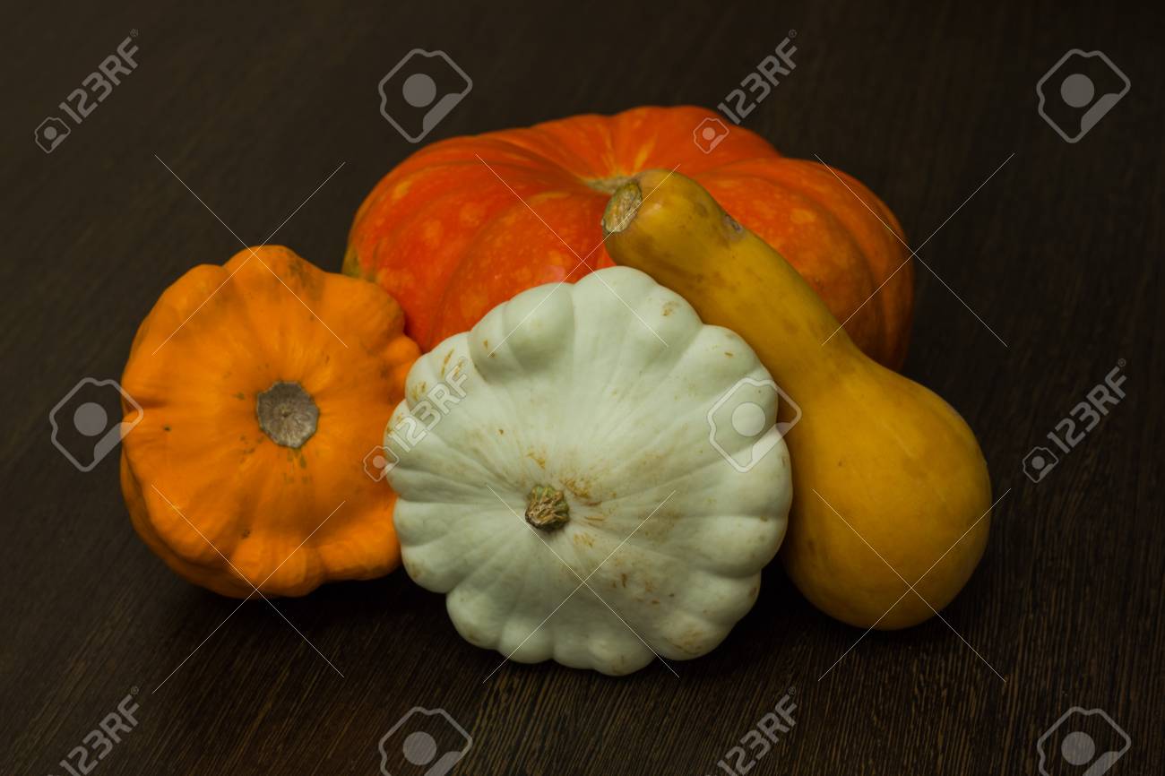 Immagini Stock Raccolta Autunnale Vari Tipi Di Zucche E Schiacciate Varieta Di Zucca E Zucchine Su Una Superficie Di Legno Image 48804944