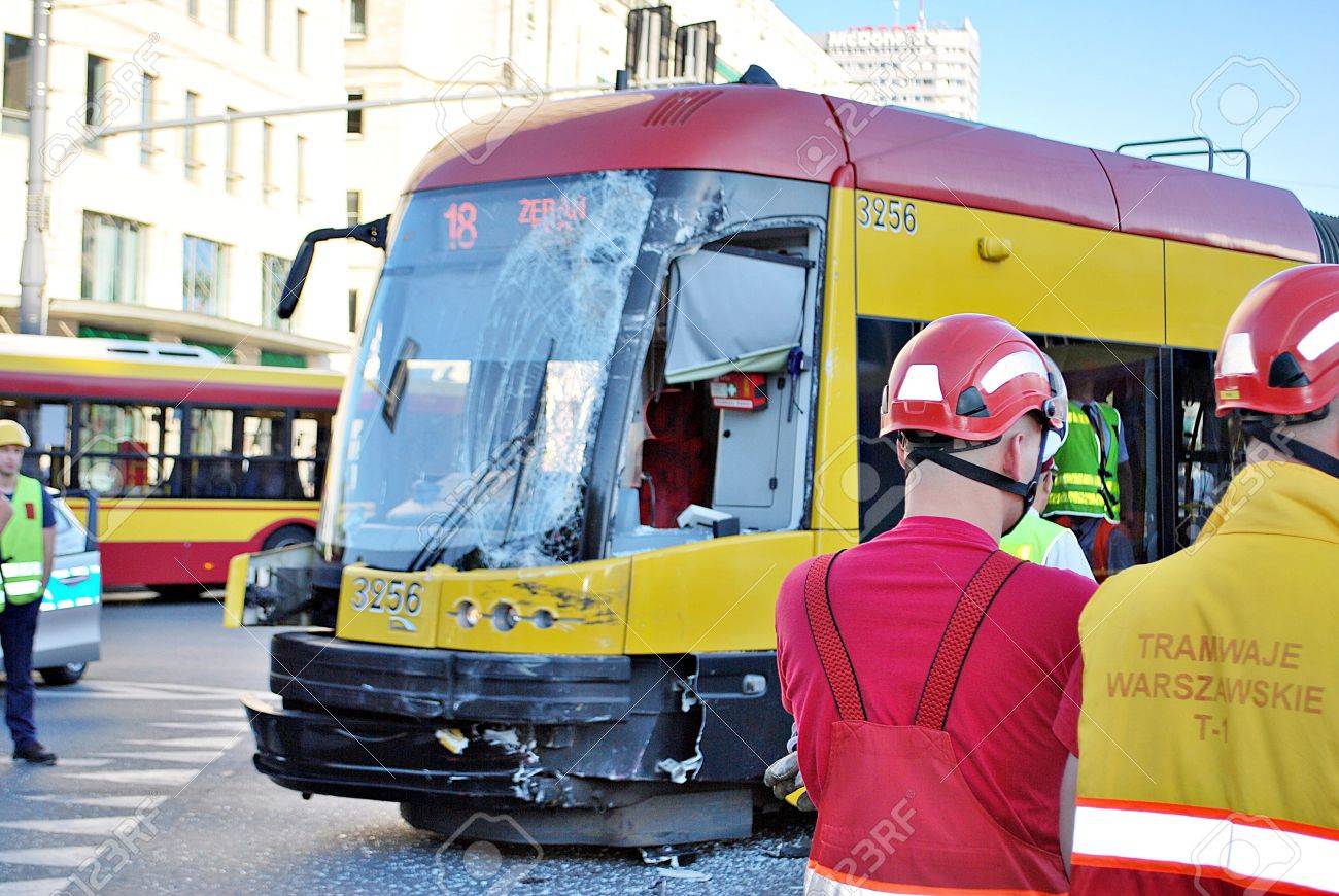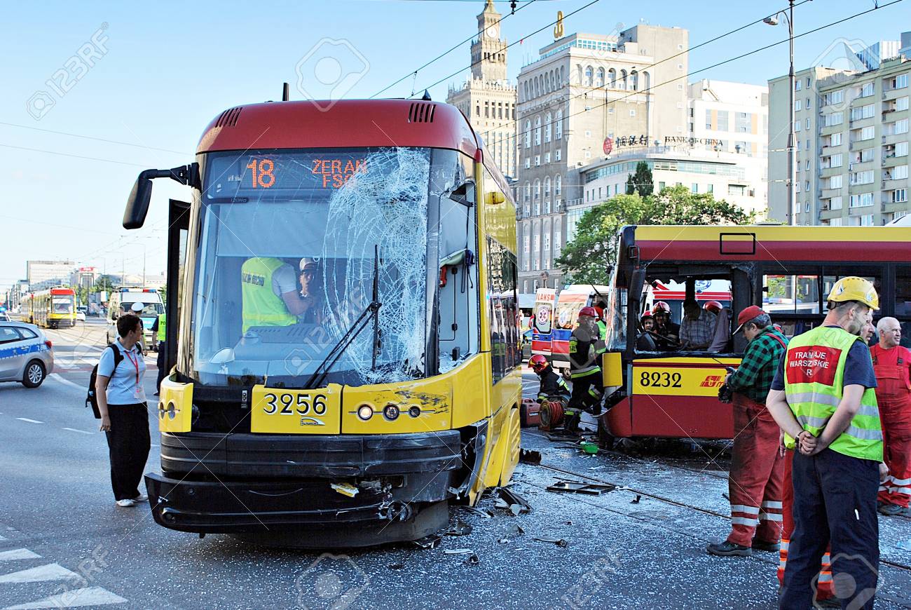 Immagini Stock Varsavia Polonia 15 Giugno 2017 Bus Della Citta Di Incidente E Tram Immagine Generale Di Un Incidente In Tram Con Un Autobus Image 80513292