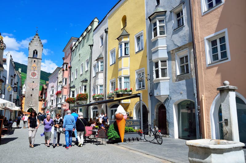 Vipiteno Italy January 23 2018 Zwolferturm Tower And People In Main Street Of The Old Medieval Town Of Vipiteno Editorial Photography Image Of Alps Meran 108991092